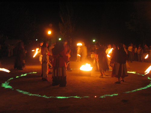 Andando em círculo vagarosamente em sentido horário (que deverá ir sendo acelerado aos poucos), visualize a energia saindo do seu athame ou dedos e marcando os limites do círculo…enquanto isso diga: